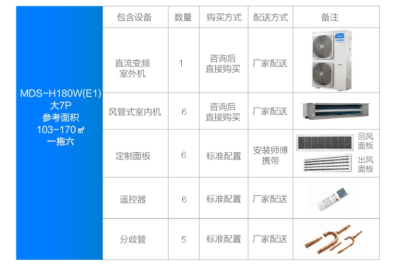 美的 一拖六變頻一級能效 多聯(lián)風管機 7匹 家用中央空調 MDS-H180W(E1)